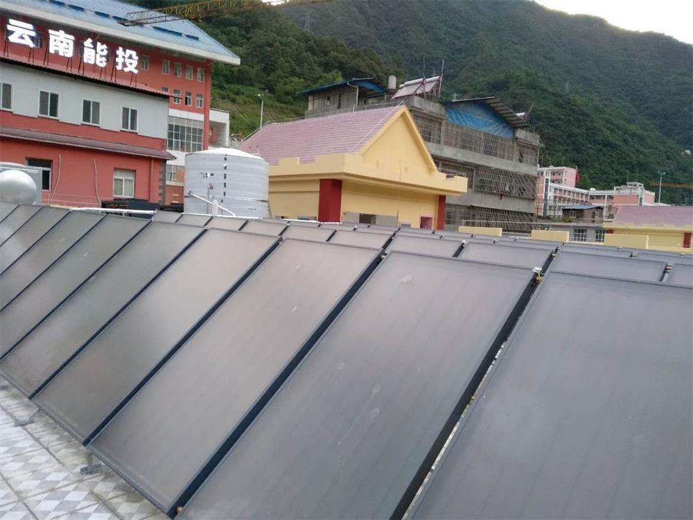 云南怒江福贡县幼儿园项目太阳能-热泵集中供热系统总价为15万元。要求用平板太阳能和空气能热泵配合使用,有阳光的时候使用太阳能,当阴雨天或热水供应不足时空气能热泵启动。经过云南太阳能贵标集团专业人员进行现场测量,热水工程师设计,方案为40块平板太阳能配50匹空气能热泵。为了保证热水的需求,又能保证机器的使用寿命,采用2台25匹空气能热泵机组,即“一备一用”。该系统还需配备回水带增压系统,均为“一备一用”。