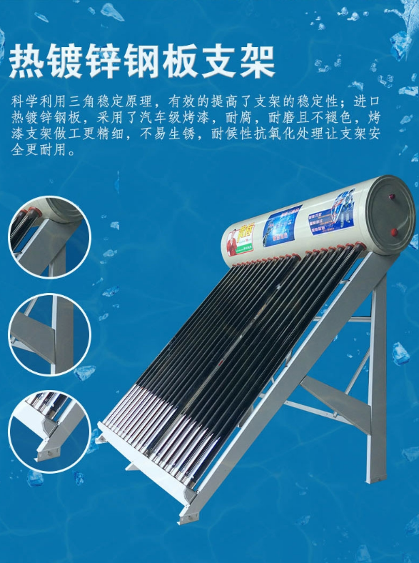 支撑集热器与保温水箱的架子。要求结构牢固,稳定性高,抗风雪,耐老化,不生锈。材质一般为不锈钢、铝合金或钢材喷塑。
